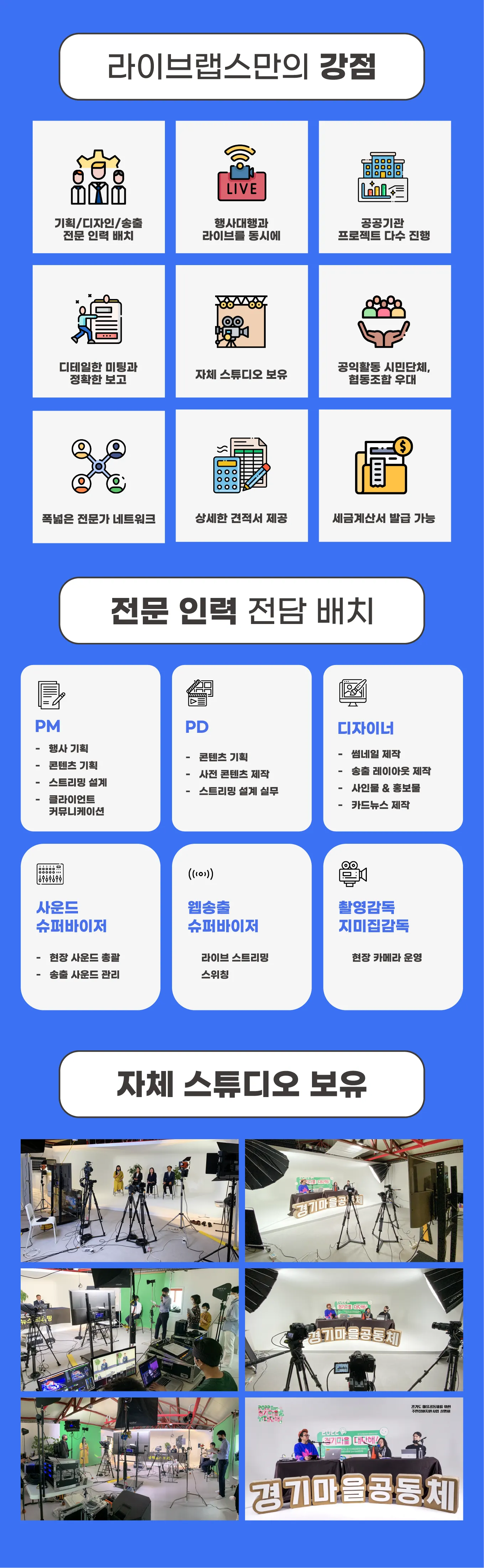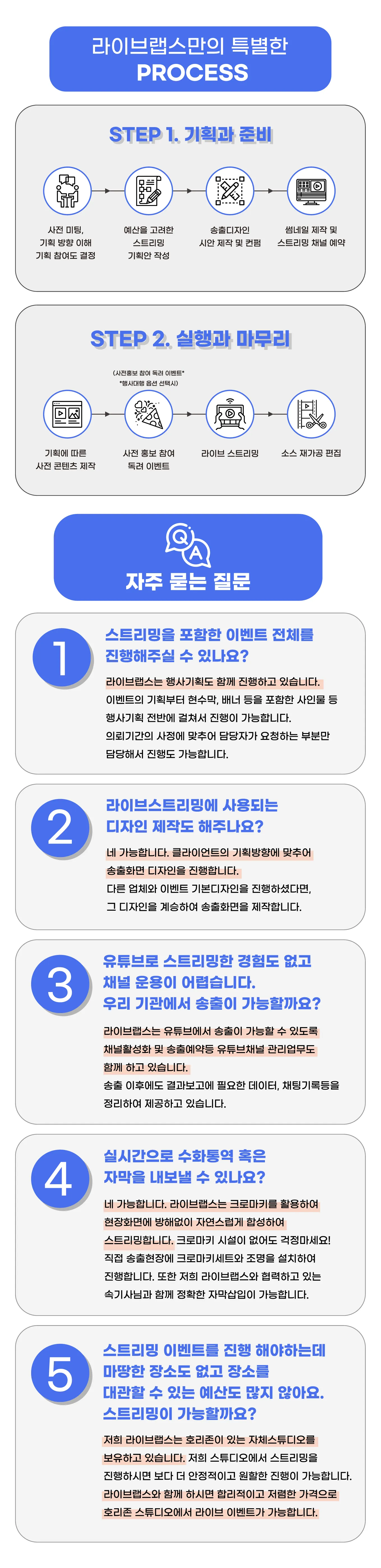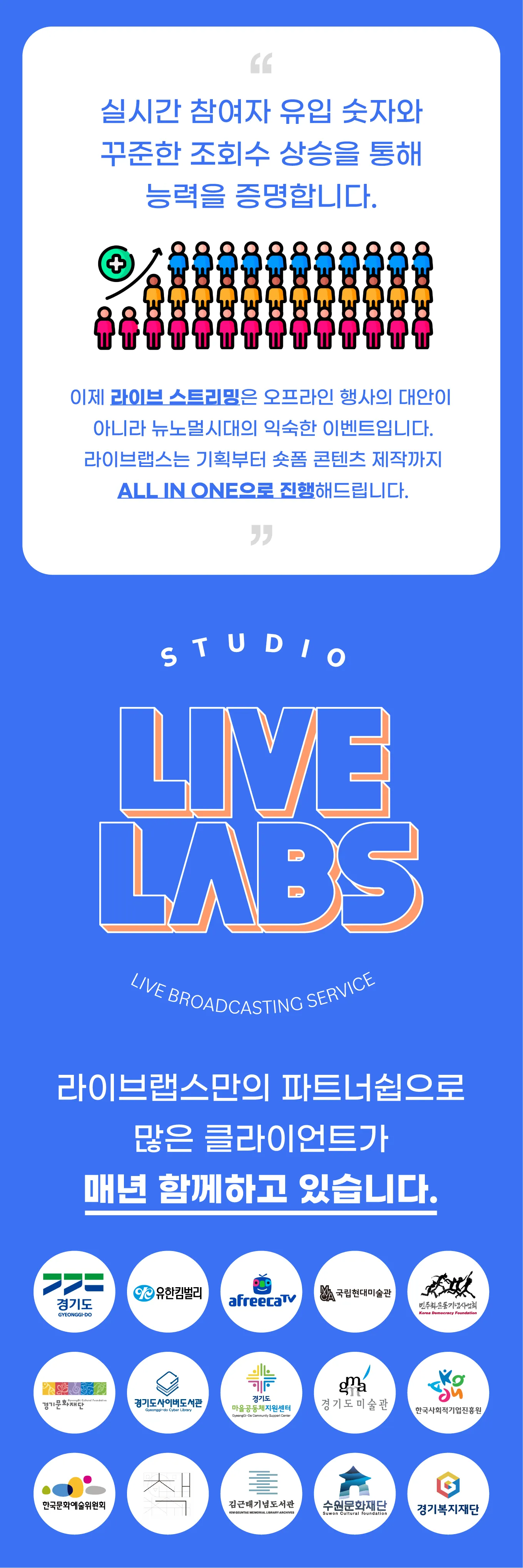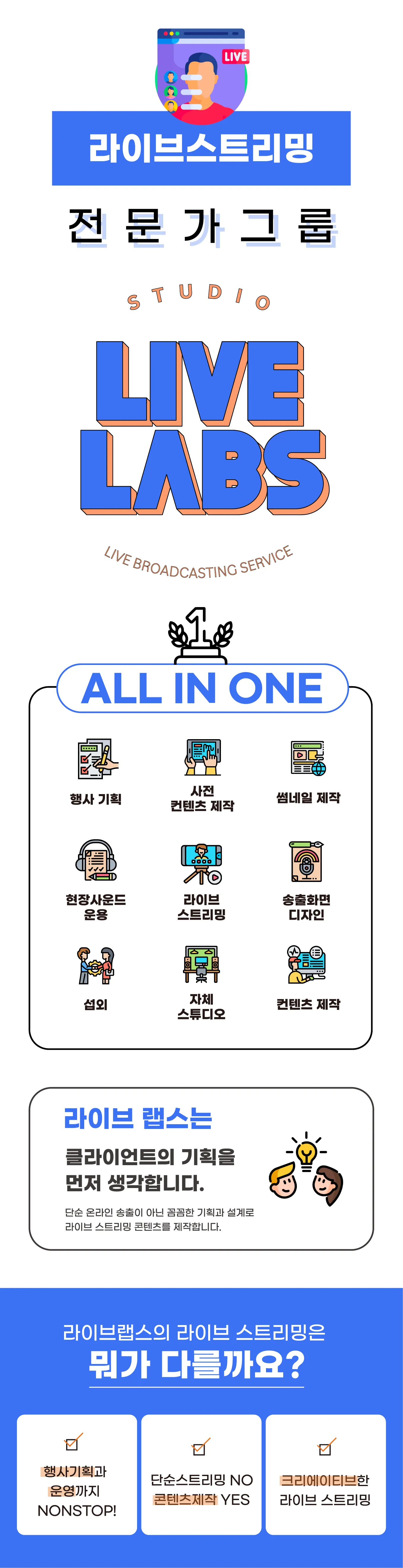 땅도프로덕션의 자랑인 라이브스트리밍 서비스는 'LIVE LABS' 브랜드로 운영됩니다. 세심한 컨설팅, 철저한 사전 테스트, 최고급 장비를 바탕으로 최상의 라이브스트리밍 서비스를 제공합니다.