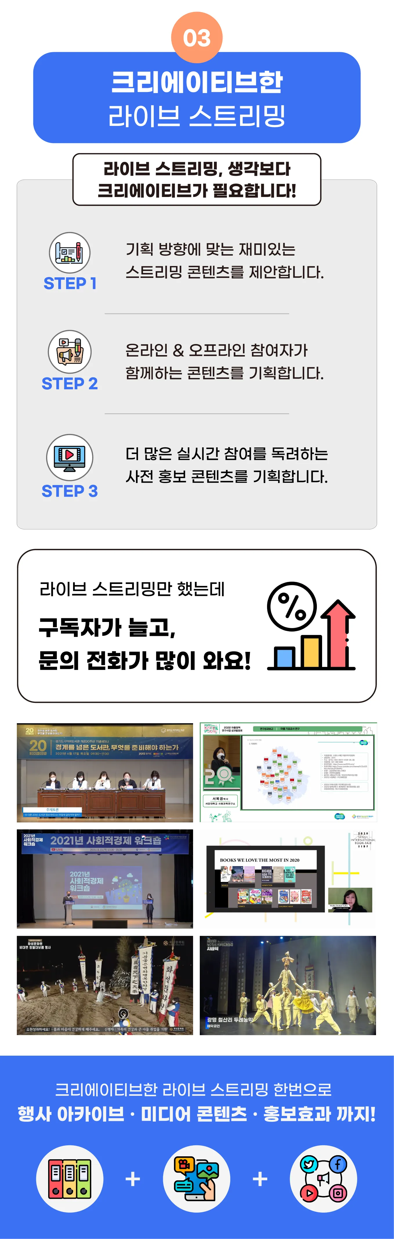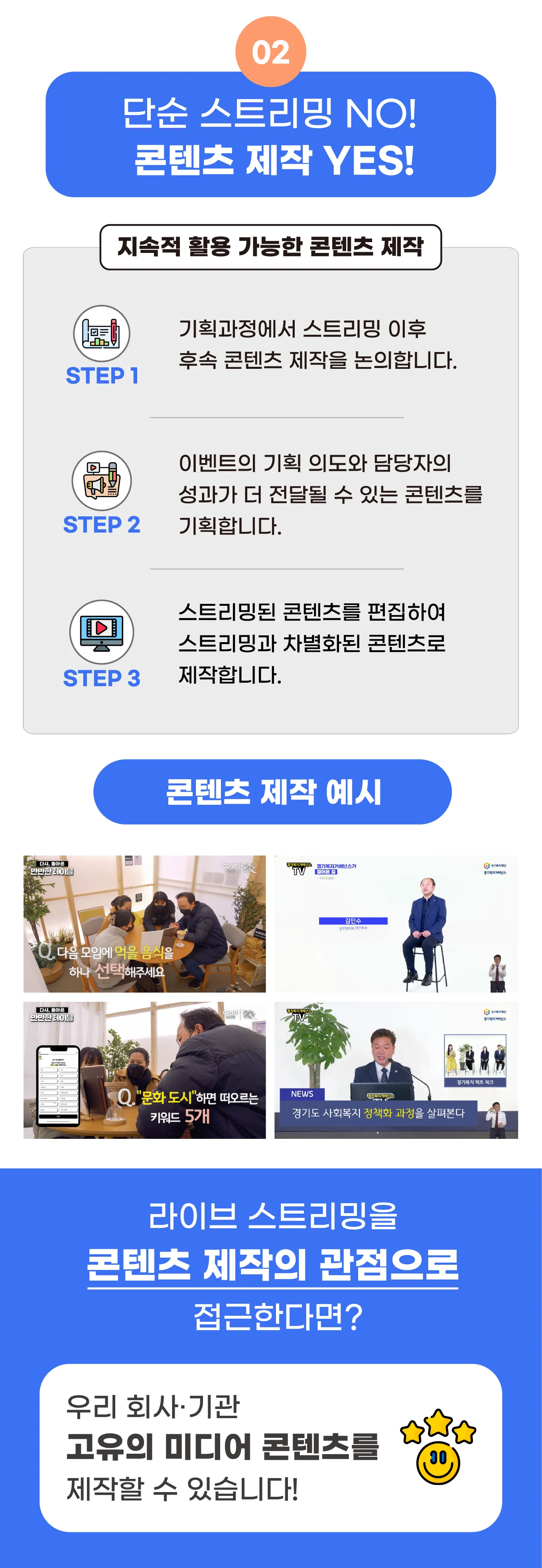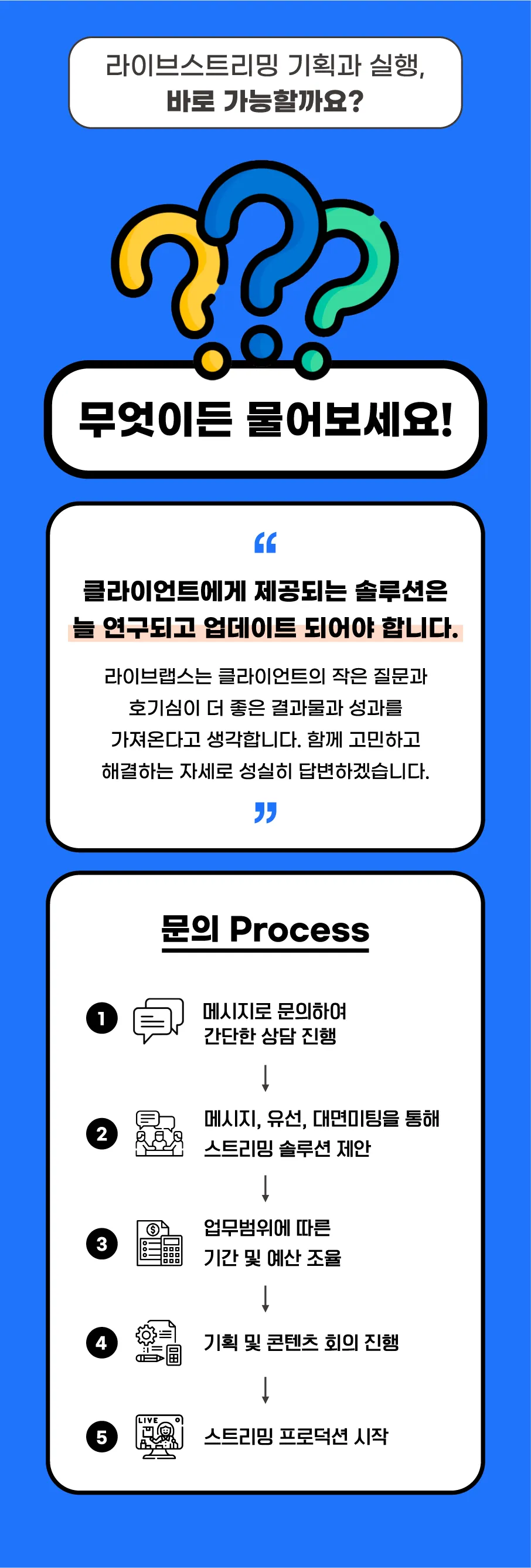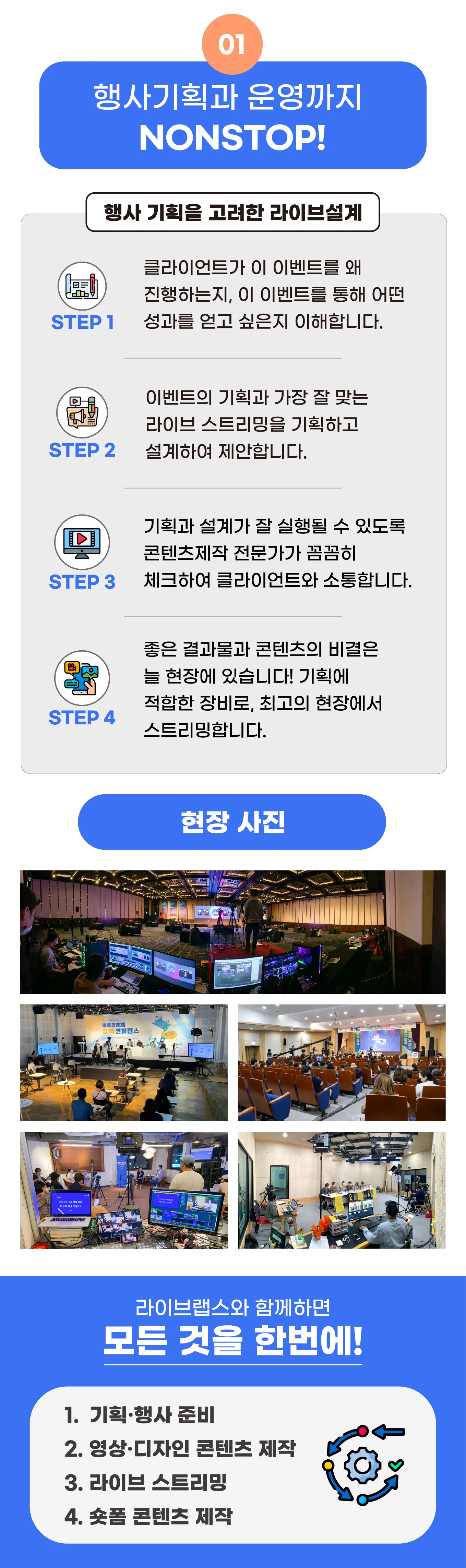 땅도프로덕션의 자랑인 라이브스트리밍 서비스는 'LIVE LABS' 브랜드로 운영됩니다. 세심한 컨설팅, 철저한 사전 테스트, 최고급 장비를 바탕으로 최상의 라이브스트리밍 서비스를 제공합니다.